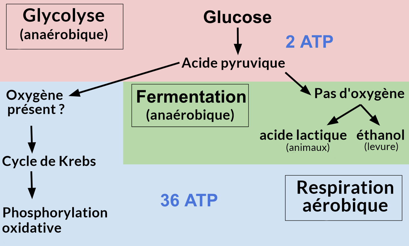 Puis la respiration peut prendre place dans deux endroits de la cellule. La glycolyse a lieu dans le cytosol (fluide à l'intérieur du cytoplasme) et elle oxyde les glucides, générant au cours de ce processus deux molécules d'ATP par molécule de glucide.